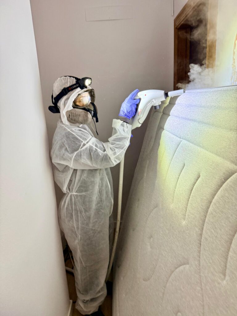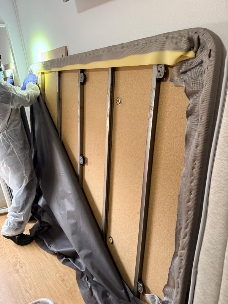 Empezamos el tratamiento térmico en la habitación donde se estaban produciendo las picaduras, por encima de la tela protectora dejo del somier aplicamos vapor seco a alta temperatura para asegurarnos de que los chinches de cama son eliminados, después como se puede ver en la imagen quitamos esta tela protectora , los chinches se esconden allí, y continuamos con la aplicación. Como se ve en la siguiente imagen, el cliente había desmontado los muebles de la habitación, lo cual agradecimos, ya que se pudo hacer aplicación de biocida de manera completa.