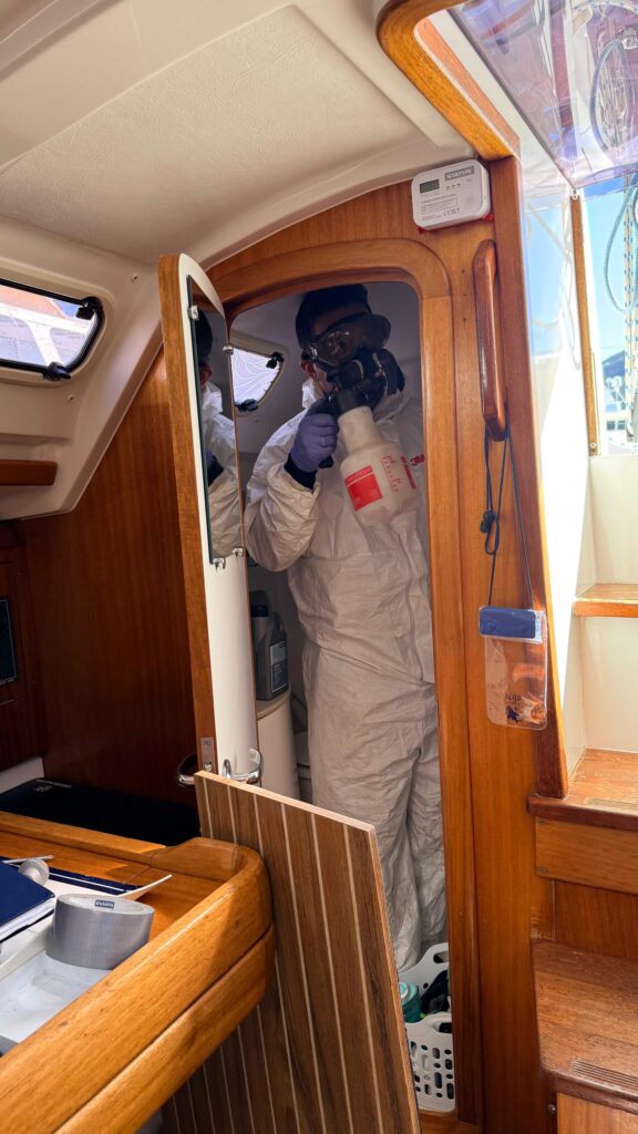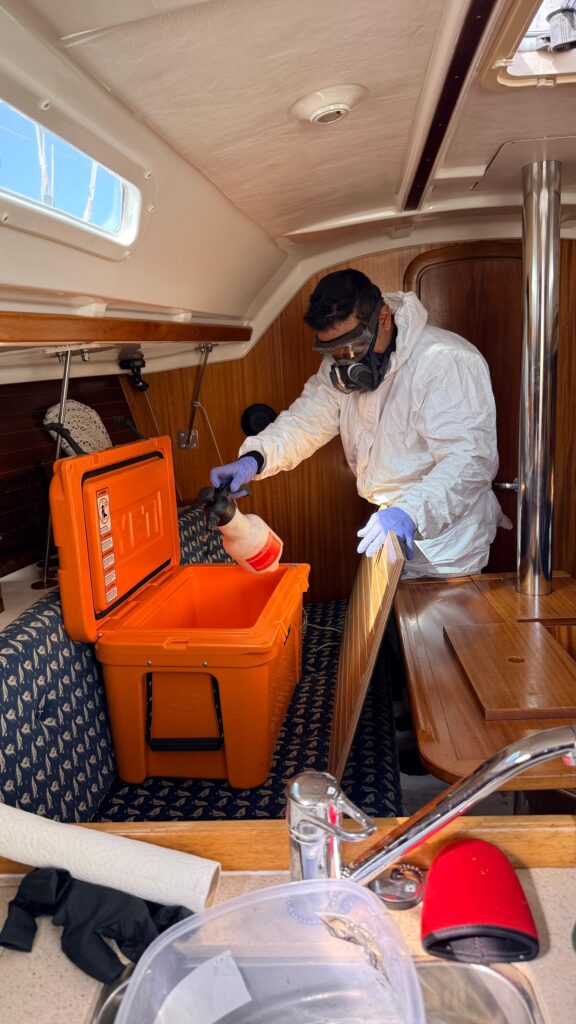 La cucarachas también pueden encontrar refugio dentro de una embarcación, la entrada de alimentos y los posibles refugios, por ejemplo , por debajo de las sentinas hay calor y humedad, sería el escondite perfecto para las cucarachas , en este caso, los roedores se habían refugiado, por algún excremento que vi durante la desinfección, todo apunta a que eran ratones. Las sentinas levantadas facilitaron mucho la desinfección del velero, el velero se encontraba en astilleros ASCAR en Cartagena. Utilizamos un desinfectante muy común pero efectivo, el peróxido de hidrógeno, lo aplicamos por pulverización localizada. Aunque el producto tiene un plazo de seguridad de 3 horas, le dijimos al cliente que hasta dentro de 24 horas no entre en el velero. Las plagas en barcos se dan con frecuencia, si notas que tienes el problema en tu barco, no lo dejes.
