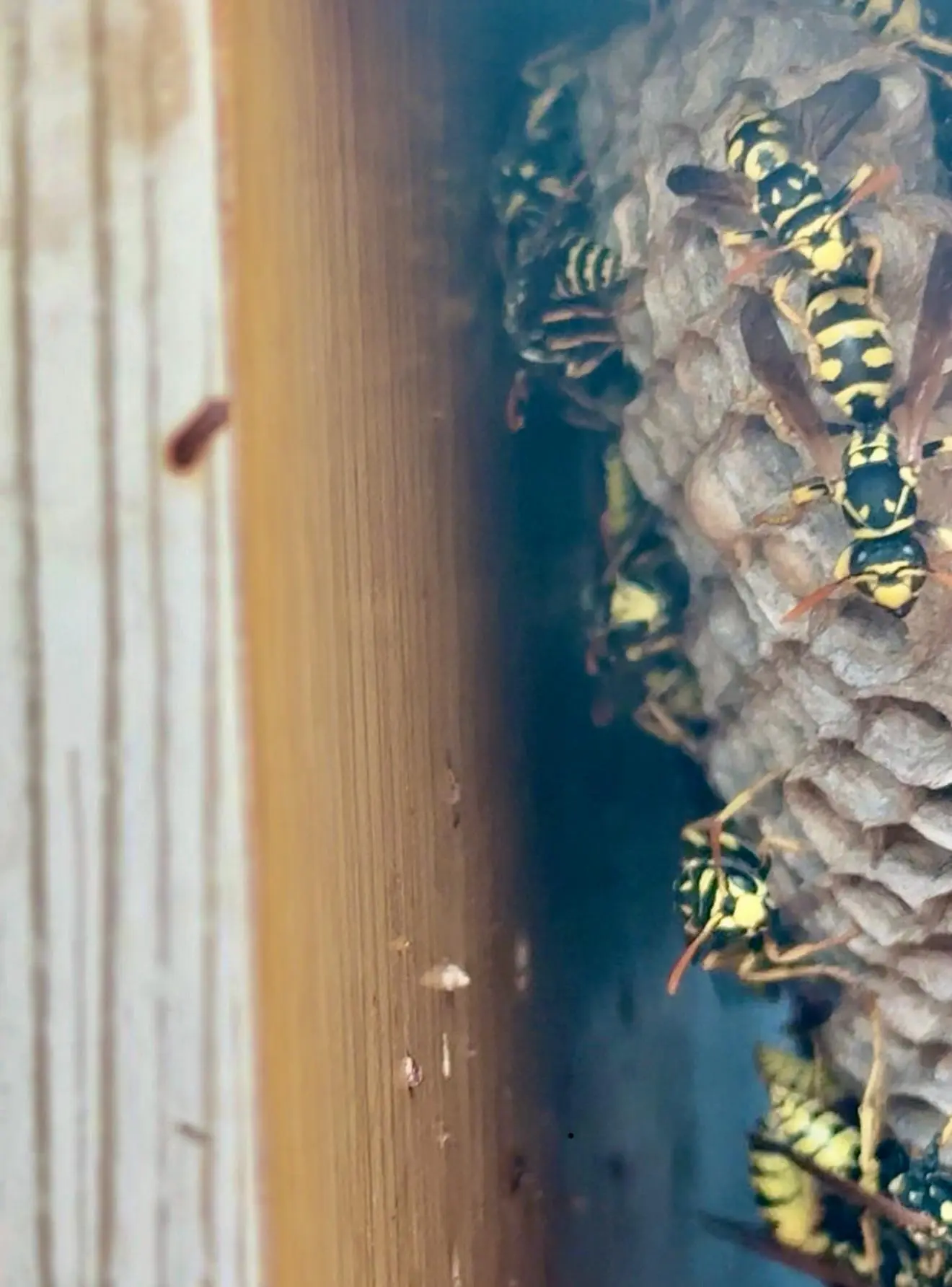 After applying insecticide, we were able to reduce part of the colony and sealed the possible entry points. The wasps died off over the following days.
