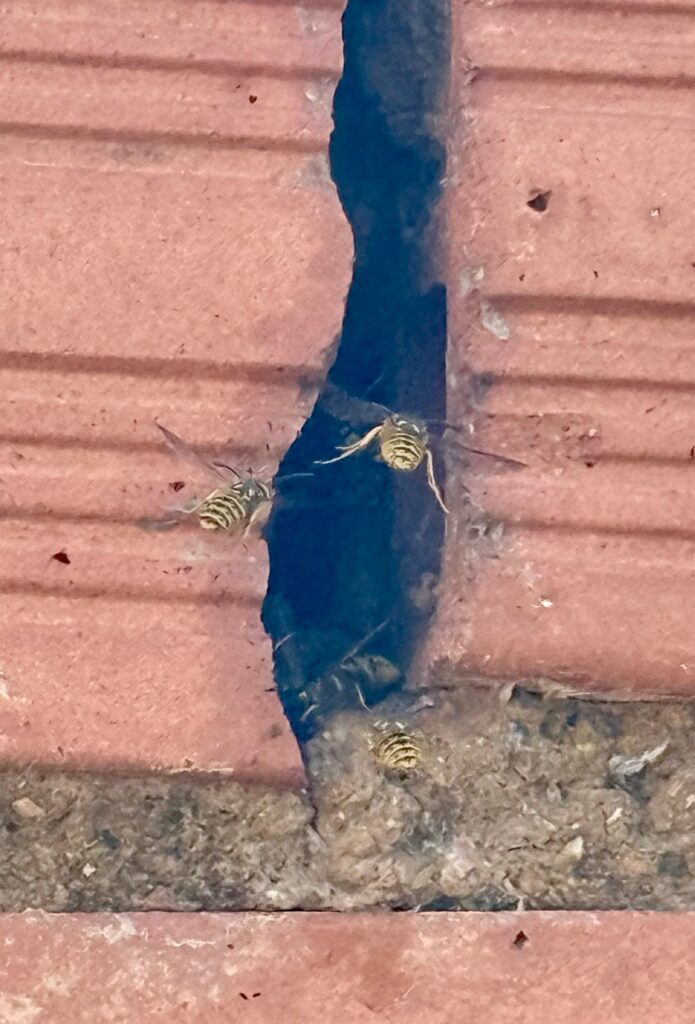 Les fissures et les trous dans les murs de briques sont aussi souvent leurs endroits préférés, et cela me rappelle il y a trois semaines ; nous avons reçu un appel de Roldán, ils avaient un nid de guêpes à l'intérieur du mur de briques. La colonie avait tellement grandi qu'elle était devenue gênante et dangereuse pour les enfants (généralement, tant que la colonie est petite, on n'y accorde pas beaucoup d'importance). À l'aide d'une machine à fumée, nous avons identifié les fissures par lesquelles elles entraient et sortaient, en plus de l'entrée principale, comme on le voit sur l'image.